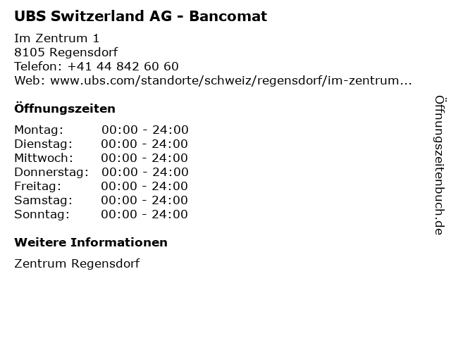 UBS Switzerland AG - Bancomat in Regensdorf: Telefonnummer, Öffnungszeiten und Adresse