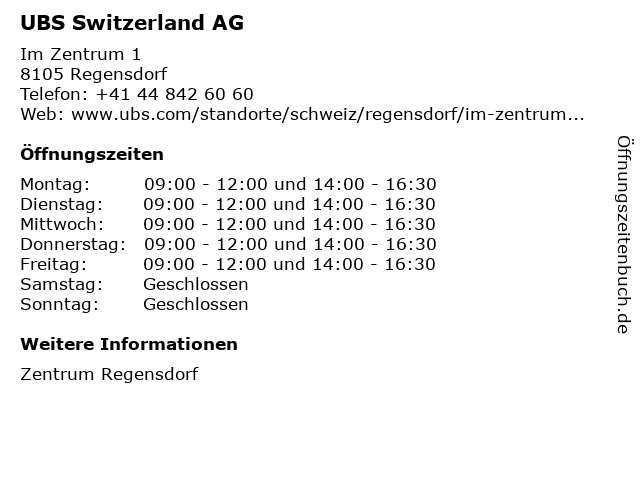| Öffnungszeiten UBS Switzerland AG in Regensdorf anzeigen | |