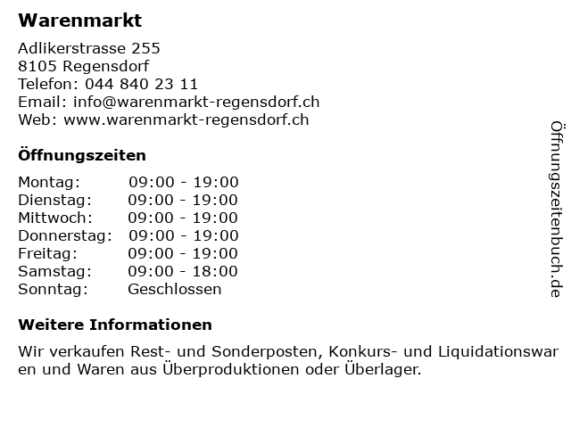 | Öffnungszeiten Warenmarkt in Regensdorf anzeigen | |