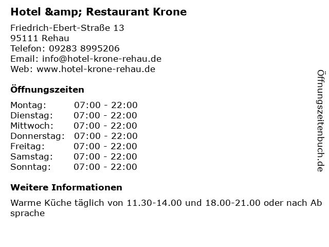| Öffnungszeiten Hotel & Restaurant Krone in Rehau anzeigen | |