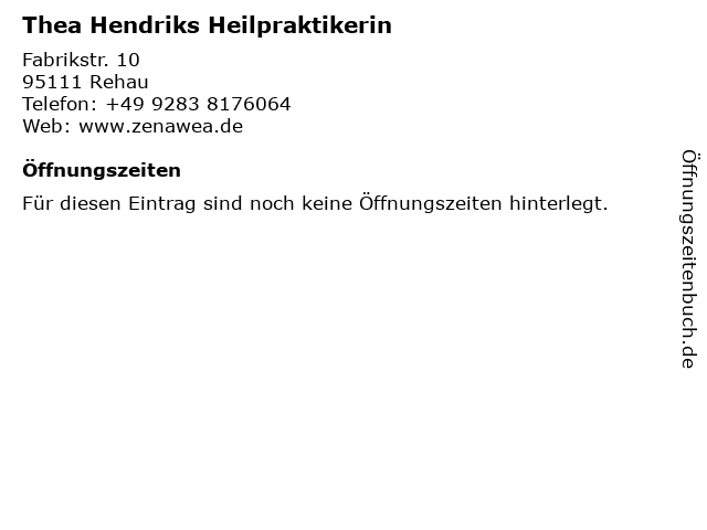 | Öffnungszeiten Thea Hendriks Heilpraktikerin in Rehau anzeigen | |