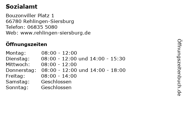 | Öffnungszeiten Sozialamt in Rehlingen-Siersburg anzeigen | |