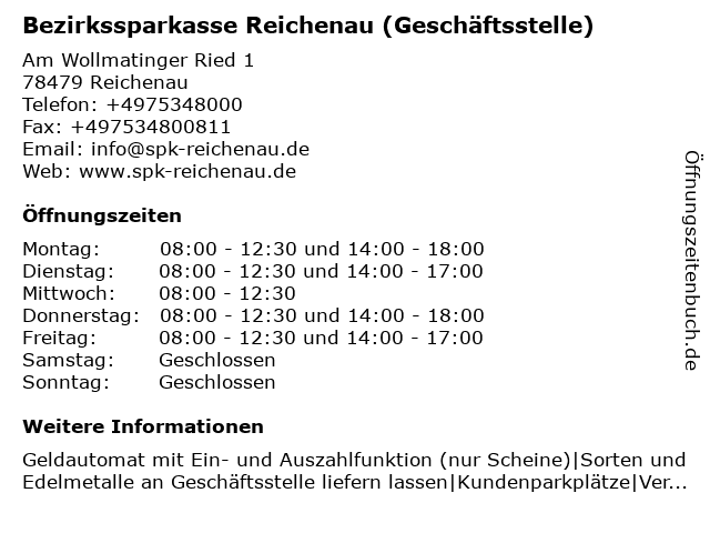 2 Bezirkssparkasse Reichenau (Geldautomat) (Entfernung: 0,03 km) Am Wollmatinger Ried 1, 78479 Reichenau 3 Bezirkssparkasse Reichenau (ServiceFiliale) (Entfernung: 2,89 km) Zum Schwarzenberg 6, 78476 Allensbach 6 Bezirkssparkasse Reichenau (Geldautomat) (Entfernung: 5,47 km) Radolfzeller Straße 16, 78476 Allensbach |