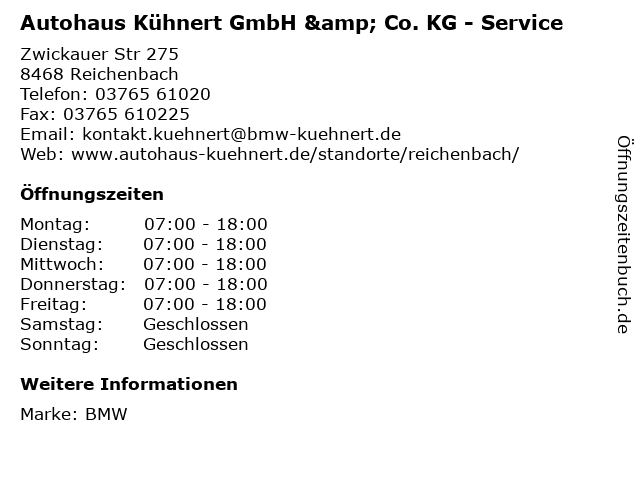 1 BMW Autohaus Kühnert GmbH & Co. KG - Verkauf (Entfernung: 0,00 km) Zwickauer Str. 275, 08468 Reichenbach 3 4 BMW Autohaus Kühnert GmbH & Co. KG - Verkauf (Entfernung: 14,64 km) Am Daßlitzer Kreuz 21, 07957 Langenwetzendorf 5 BMW Autohaus Kühnert GmbH & Co. KG - Service und Teile (Entfernung: 14,64 km) Am Daßlitzer Kreuz 21, 07957 Langenwetzendorf 6 |