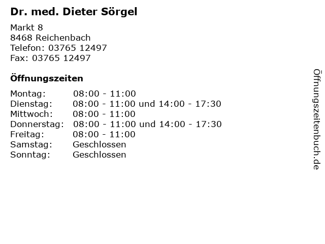 | Öffnungszeiten Dr. med. Dieter Sörgel in Reichenbach anzeigen | |