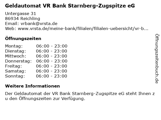 | Öffnungszeiten Geldautomat VR Bank Starnberg-Zugspitze eG in Reichling anzeigen | |