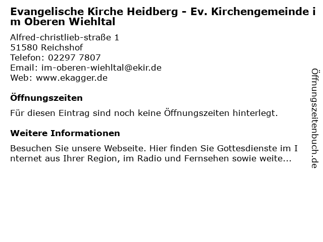 Branchen & Suchbegriffe zu Evangelische Kirche Heidberg - Ev. Kirchengemeinde im Oberen Wiehltal:ev., evangelische, heidberg, kirche, kirchengemeinde, oberen, wiehltal |