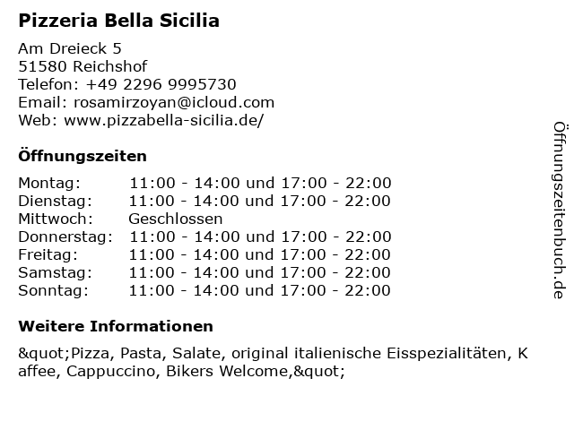 | Öffnungszeiten Pizzeria Bella Sicilia in Reichshof anzeigen | |