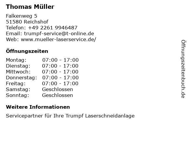 | Öffnungszeiten Thomas Müller in Reichshof anzeigen | |