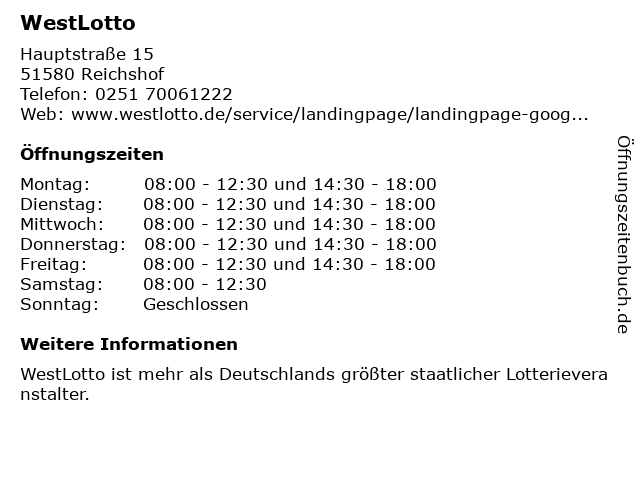 | Öffnungszeiten WestLotto in Reichshof anzeigen | |