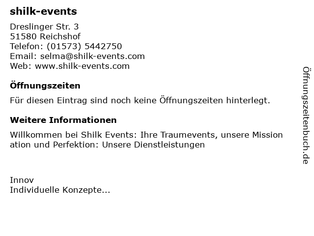 | Öffnungszeiten shilk-events in Reichshof anzeigen | |