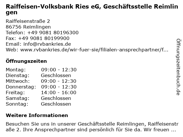 Branchen & Suchbegriffe zu Raiffeisen-Volksbank Ries eG, Geschäftsstelle Reimlingen:defibrillator, eg, geldautomat, geschäftsstelle, kontoauszugsdrucker, mobilfunk-karte aufladbar, raiffeisen, reimlingen, ries, volksbank |