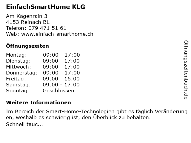 | Öffnungszeiten EinfachSmartHome KLG in Reinach BL anzeigen | |