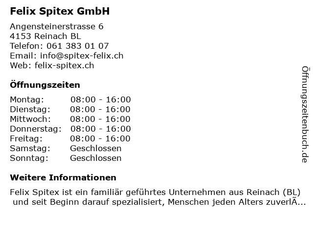 | Öffnungszeiten Felix Spitex GmbH in Reinach BL anzeigen | |