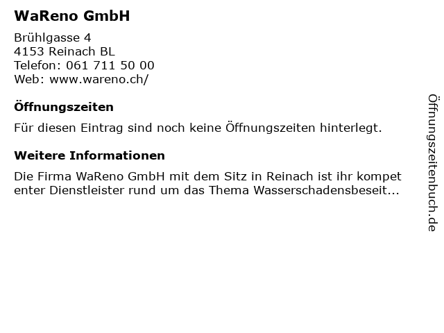 | Öffnungszeiten WaReno GmbH in Reinach BL anzeigen | |