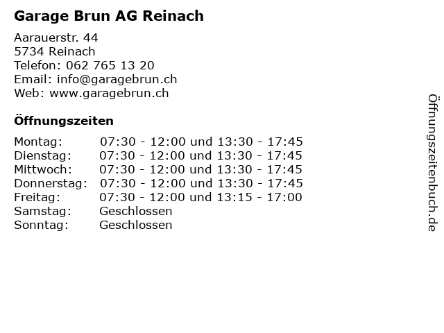 | Öffnungszeiten Garage Brun AG Reinach in Reinach anzeigen | |
