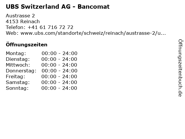 UBS Switzerland AG - Bancomat in Reinach: Telefonnummer, Öffnungszeiten und Adresse