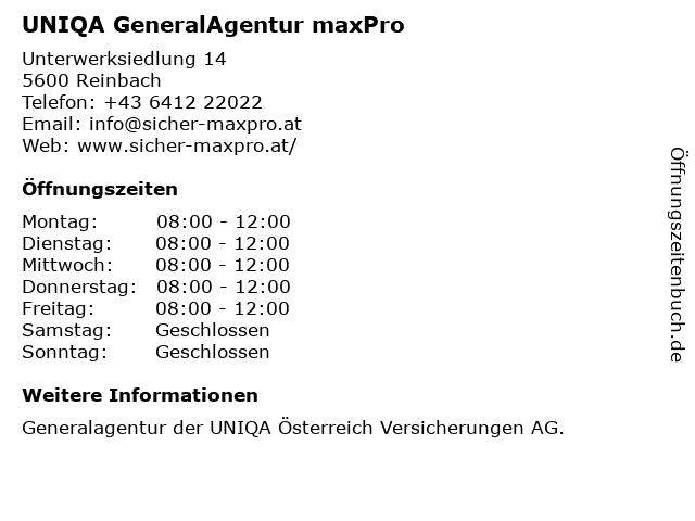| Öffnungszeiten UNIQA GeneralAgentur maxPro in Reinbach anzeigen | |