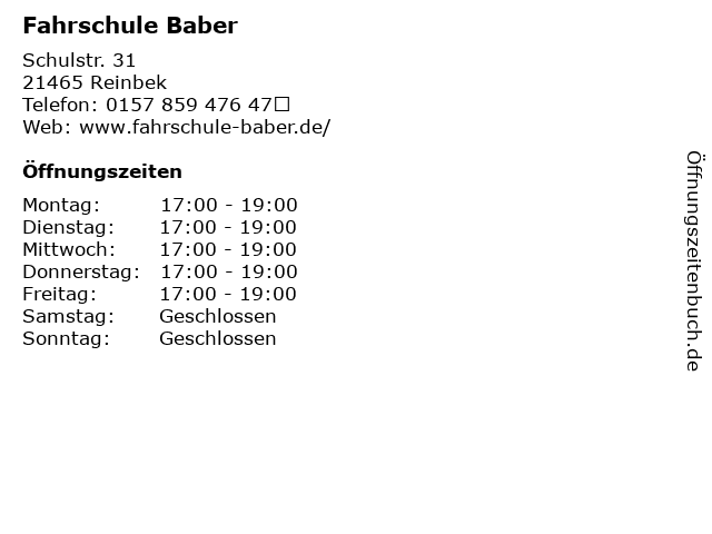 | Öffnungszeiten Fahrschule Baber in Reinbek anzeigen | |
