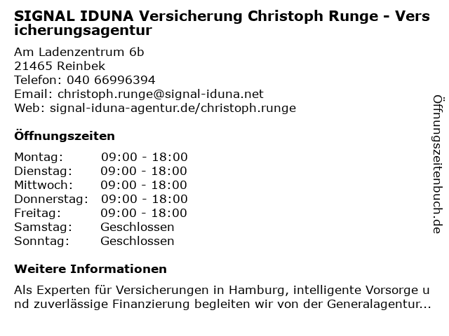 3 SIGNAL IDUNA Versicherung Frank Petersen - Versicherungsagentur (Entfernung: 1,17 km) Schmiedesberg 2c, 21465 Reinbek 4 SIGNAL IDUNA Versicherung Marius Berndt - Versicherungsagentur (Entfernung: 1,56 km) Gutenbergstr. 17, 21465 Reinbek 5 SIGNAL IDUNA Versicherung Iris Lorenz - Versicherungsagentur (Entfernung: 1,85 km) Helmuth-hübener-weg 9, 21031 Hamburg 6 |