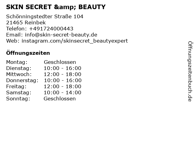 | Öffnungszeiten SKIN SECRET & BEAUTY in Reinbek anzeigen | |