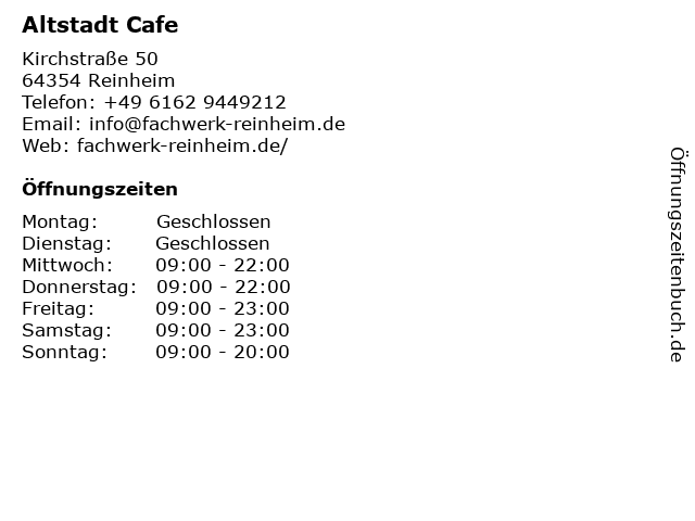 | Öffnungszeiten Altstadt Cafe in Reinheim anzeigen | |