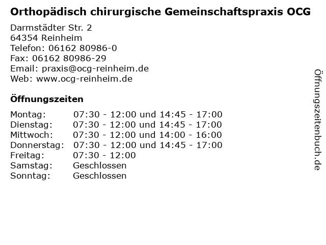 1 Orthopädisch chirurgische Gemeinschaftspraxis OCG (Entfernung: 1,08 km) Willy-Brandt-Straße 22, 64354 Reinheim 2 Susanne Ising und Dr. Sylvia Kern Tierärztliche Gemeinschaftspraxis für Klein- und Heimtiere (Entfernung: 10,31 km) Rheinstraße 30, 64367 Mühltal 3 Dr. med. Hans D. Geipert & Dr. med. Uwe Wolfram - Orthopädische Gemeinschaftspraxis (Entfernung: 10,51 km) Rheinstraße 49, 64367 Mühltal 4 Urologische Gemeinschaftspraxis Dr. Jungmann und Dr. Weißenfels (Entfernung: 13,08 km) Dieburger Straße 31c, 64287 Darmstadt 5 Gemeinschaftspraxis Dietmar Pertack Daniel Pertack und Katharina Pertack (Entfernung: 13,32 km) Sophienstr. 2, 64297 Darmstadt 6 |