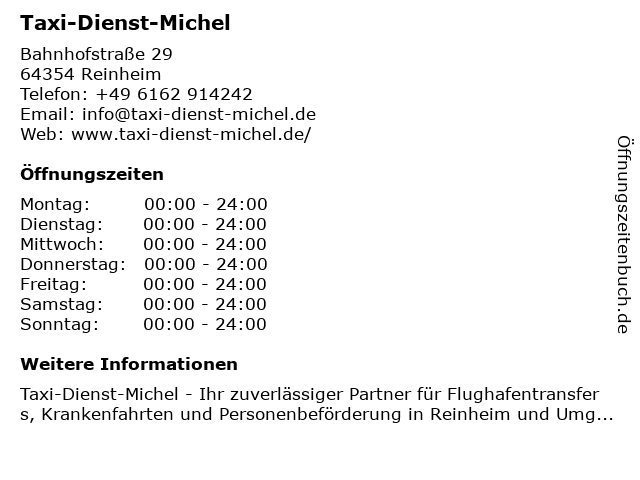 | Öffnungszeiten Taxi-Dienst-Michel in Reinheim anzeigen | |