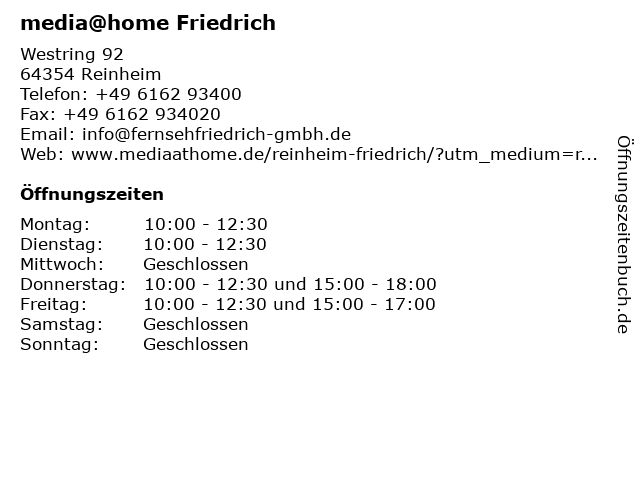 | Öffnungszeiten media@home Friedrich in Reinheim anzeigen | |