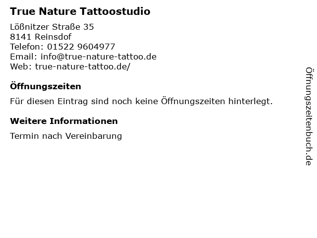 | Öffnungszeiten True Nature Tattoostudio in Reinsdof anzeigen | |