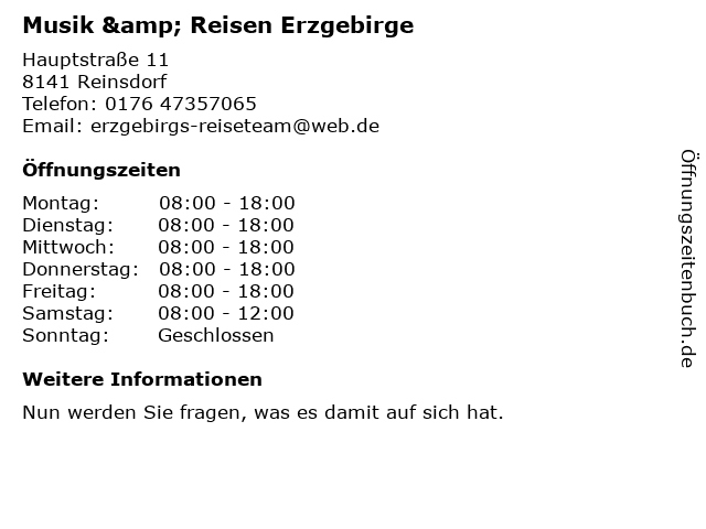 | Öffnungszeiten Musik & Reisen Erzgebirge in Reinsdorf anzeigen | |