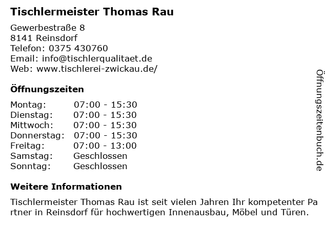 | Öffnungszeiten Tischlermeister Thomas Rau in Reinsdorf anzeigen | |