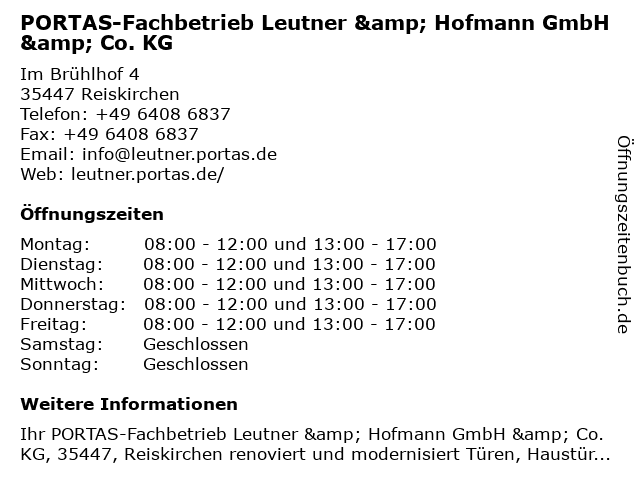 1 PORTAS-Fachbetrieb Leutner & Hofmann GmbH & Co. KG (Entfernung: 0,00 km) Im Brühlhof 4, 35447 Reiskirchen 6 |