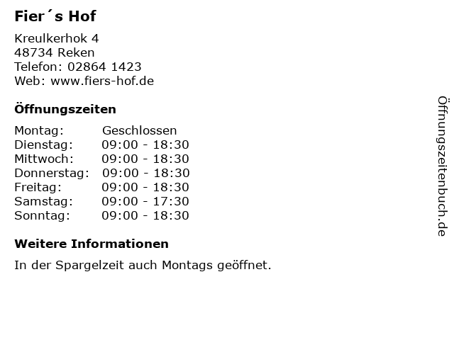 | Öffnungszeiten Fier´s Hof in Reken anzeigen | |