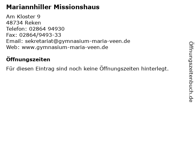 | Öffnungszeiten Mariannhiller Missionshaus in Reken anzeigen | |