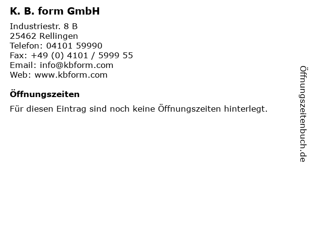 | Öffnungszeiten K. B. form GmbH in Rellingen anzeigen | |