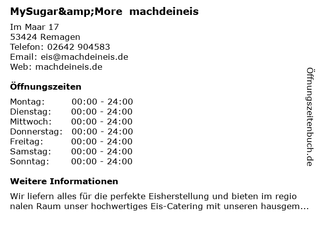 | Öffnungszeiten MySugar&More machdeineis in Remagen anzeigen | |