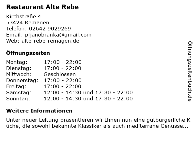 | Öffnungszeiten Restaurant Alte Rebe in Remagen anzeigen | |