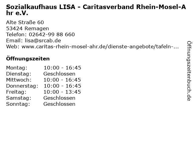 Branchen & Suchbegriffe zu Sozialkaufhaus LISA - Caritasverband Rhein-Mosel-Ahr e.V.:ahr, artikel für das tägliche leben, bad, bekleidung, caritasverband, e.v., hausrat, lisa, mosel, rhein, sozialkaufhaus |