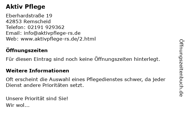 | Öffnungszeiten Aktiv Pflege in Remscheid anzeigen | |
