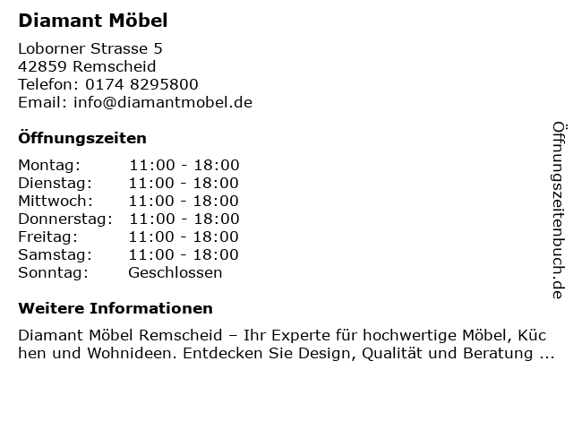 | Öffnungszeiten Diamant Möbel in Remscheid anzeigen | |