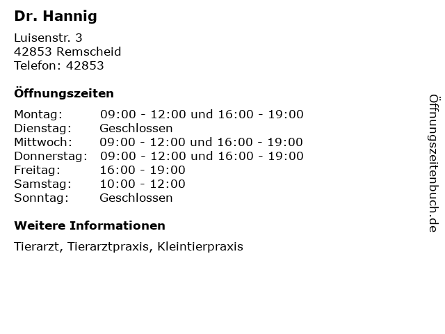 | Öffnungszeiten Dr. Hannig in Remscheid anzeigen | |