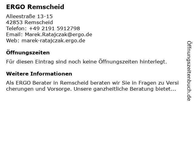 | Öffnungszeiten ERGO Remscheid in Remscheid anzeigen | |