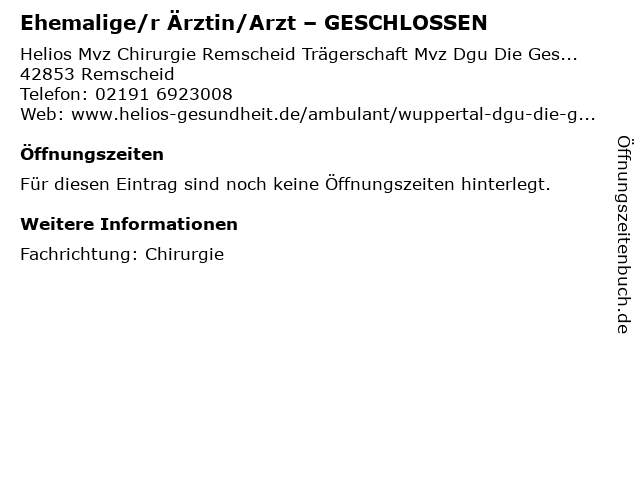 1 Ehemalige/r Ärztin/Arzt – GESCHLOSSEN (Entfernung: 10,08 km) Orthopädisch-chirurgisches Centrum Wuppertal Occ , 42275 Wuppertal 3 4 6 Dr. med. Happy Sauldie - Arzt für Allgemeinmedizin (Entfernung: 0,77 km) Salemstraße 4, 42853 Remscheid |