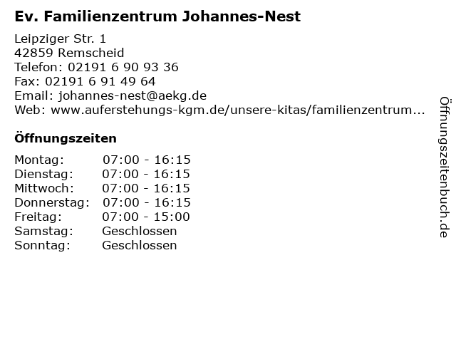 1 Ev. Johannes-Kirchengemeinde Pfr. S. Spenner-Feistauer u. R. Feistauer (Entfernung: 0,55 km) Karl-Kahlhöfer-Str. 2, 42855 Remscheid 3 Ev. Johannes-Kirchengemeinde Gemeindehaus Eschenstr. (Entfernung: 1,23 km) Eschenstr. 25, 42855 Remscheid 5 Interkulturelle Kindertagesstätte und Familienzentrum Confetti (Entfernung: 1,54 km) Rosenhügeler Straße 61, 42859 Remscheid 6 Elterinitiative Kraftstation e.V. Kindertageseinrichtung und Familienzentrum Nordstraße (Entfernung: 1,61 km) Nordstraße 4, 42853 Remscheid |
