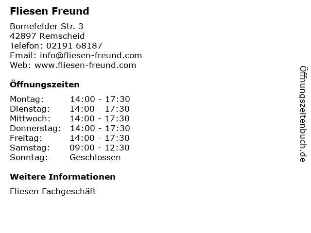 | Öffnungszeiten Fliesen Freund in Remscheid anzeigen | |