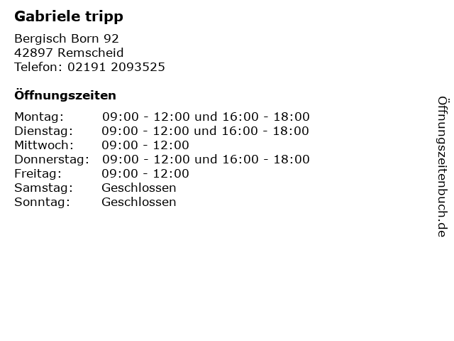 | Öffnungszeiten Gabriele tripp in Remscheid anzeigen | |