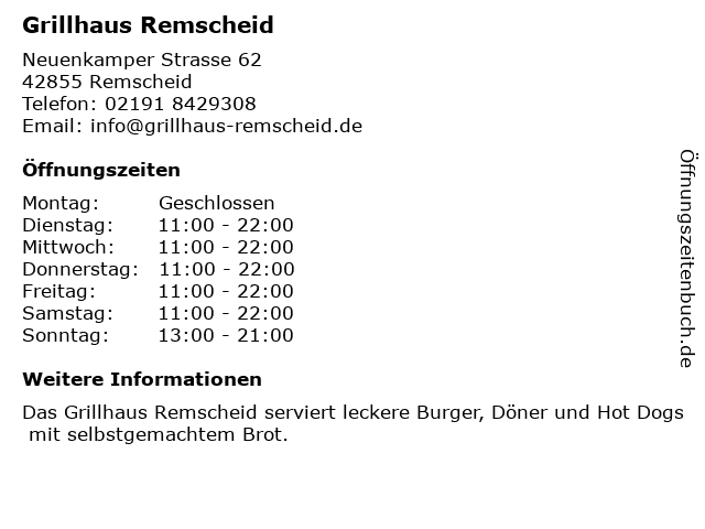 | Öffnungszeiten Grillhaus Remscheid in Remscheid anzeigen | |