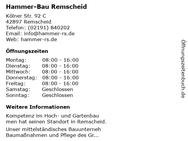 | Öffnungszeiten Hammer-Bau Remscheid in Remscheid anzeigen | |