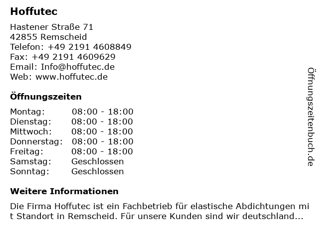 | Öffnungszeiten Hoffutec in Remscheid anzeigen | |